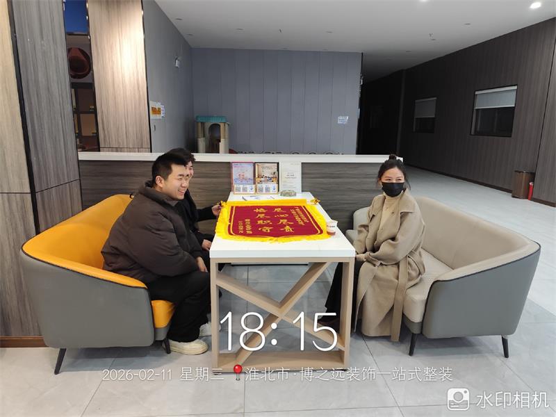 祥源府3棟2102業(yè)主在完工后專程送來錦旗,向項目經(jīng)理劉騰飛,設(shè)計師董欣表達感謝,